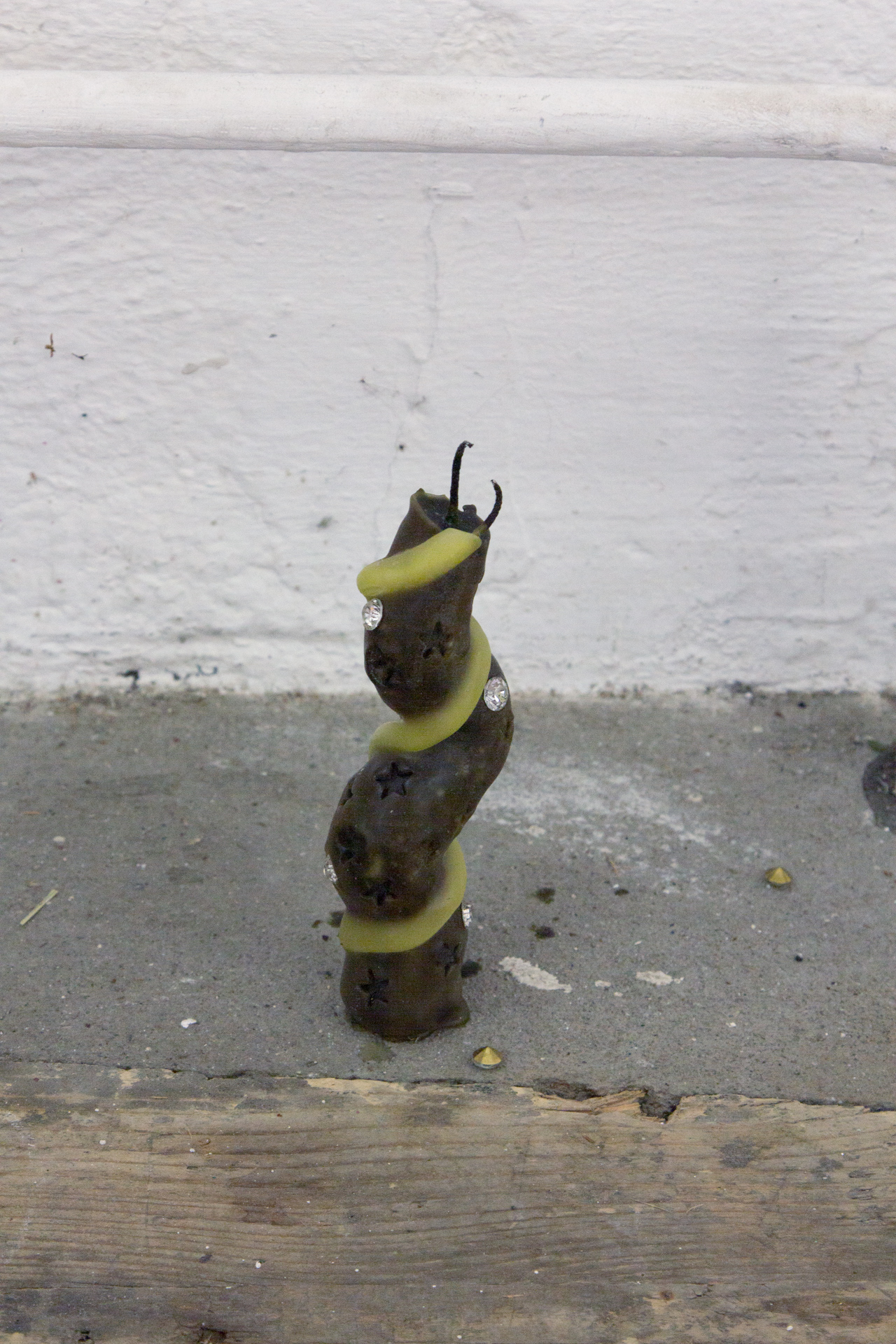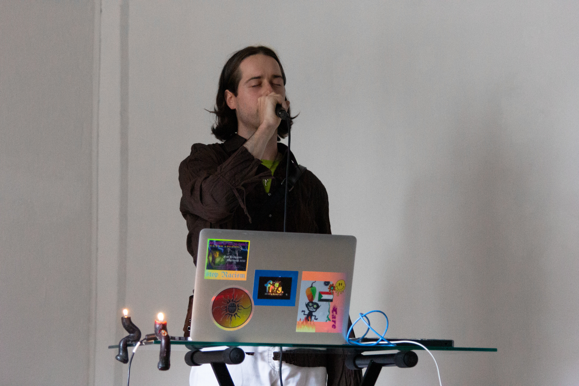 In seiner Musik-Performance day 1 of getting rid of my trampoline guilt (really sad and unbounced) reagiert Simeon Sigg auf die architektonischen Gegebenheiten des Raums und auf die Werke der anderen Künstler*innen. In der Musik treten durch Field Recordings, Saxophon, synthetische Klänge und Gesang weitere Räume hervor. Dabei bindet er Props, wie die Kerzen des Künstlers Mattia Comuzzi mit ein. Diese zusätzlichen Akteure, so wie die Musik selbst, lässt er zwischenzeitlich zu den eigentlichen Performer:innen werden.