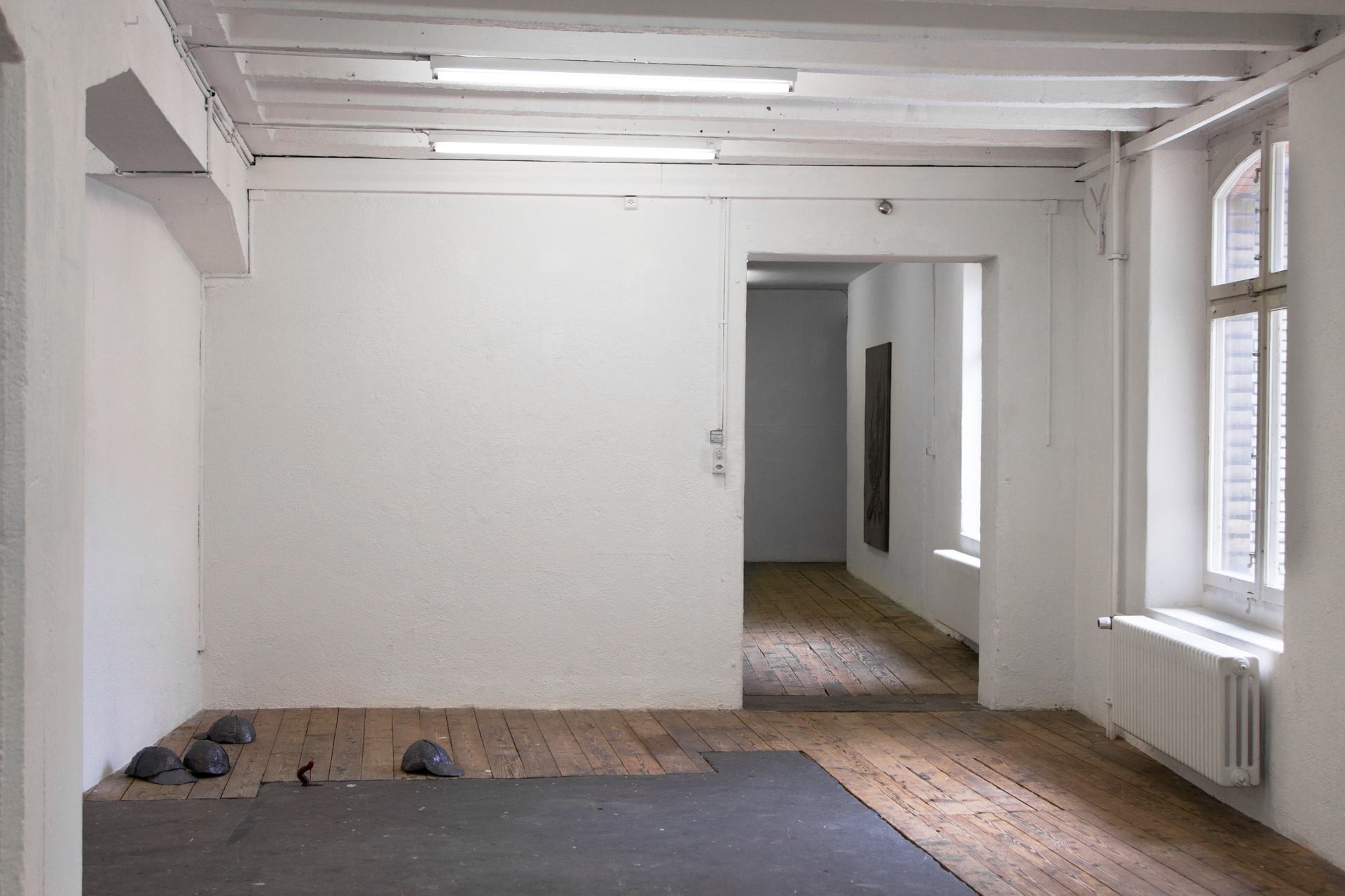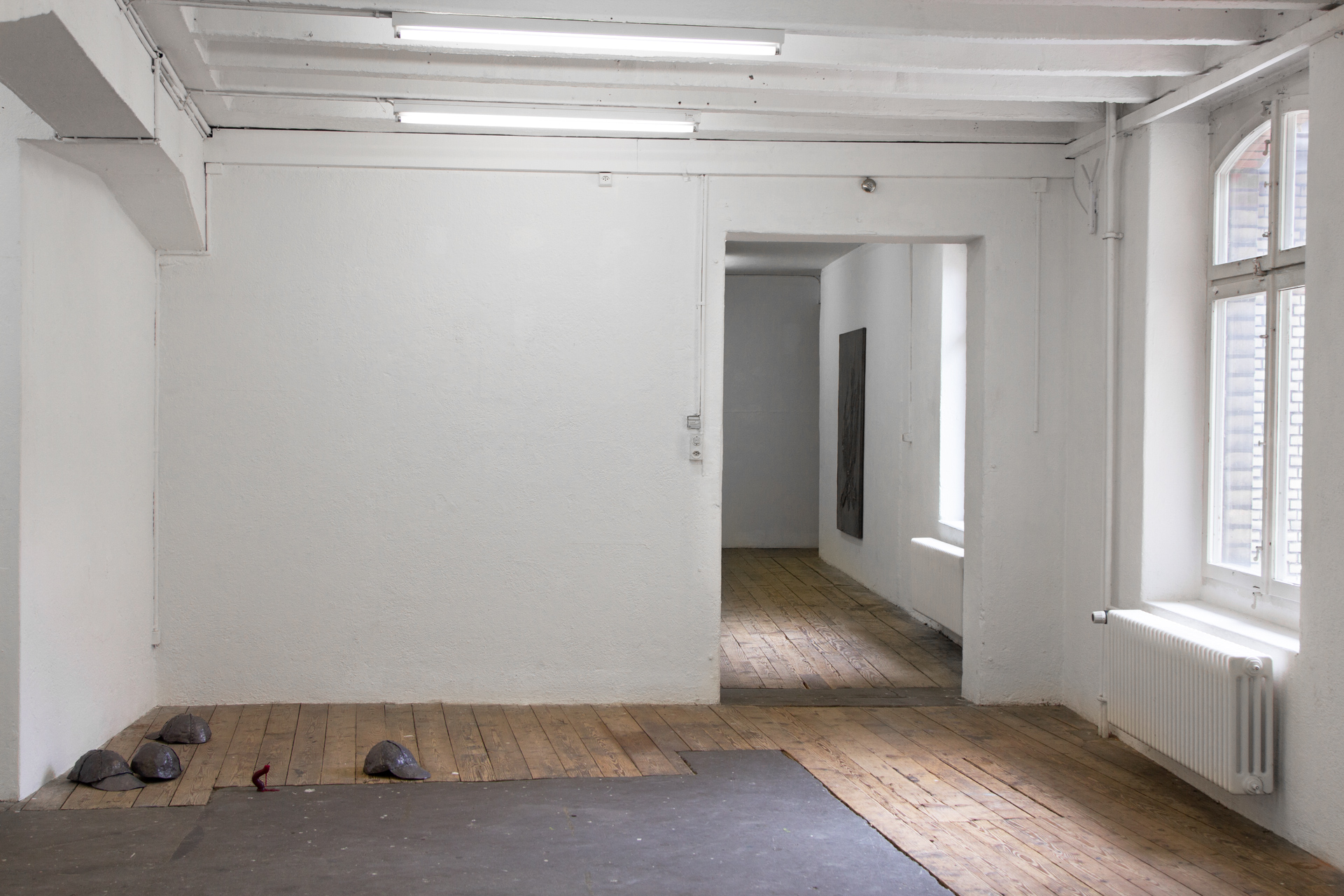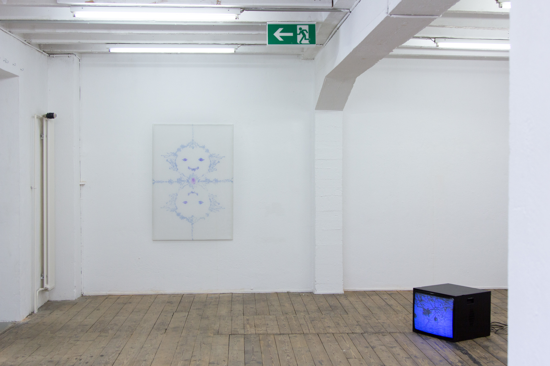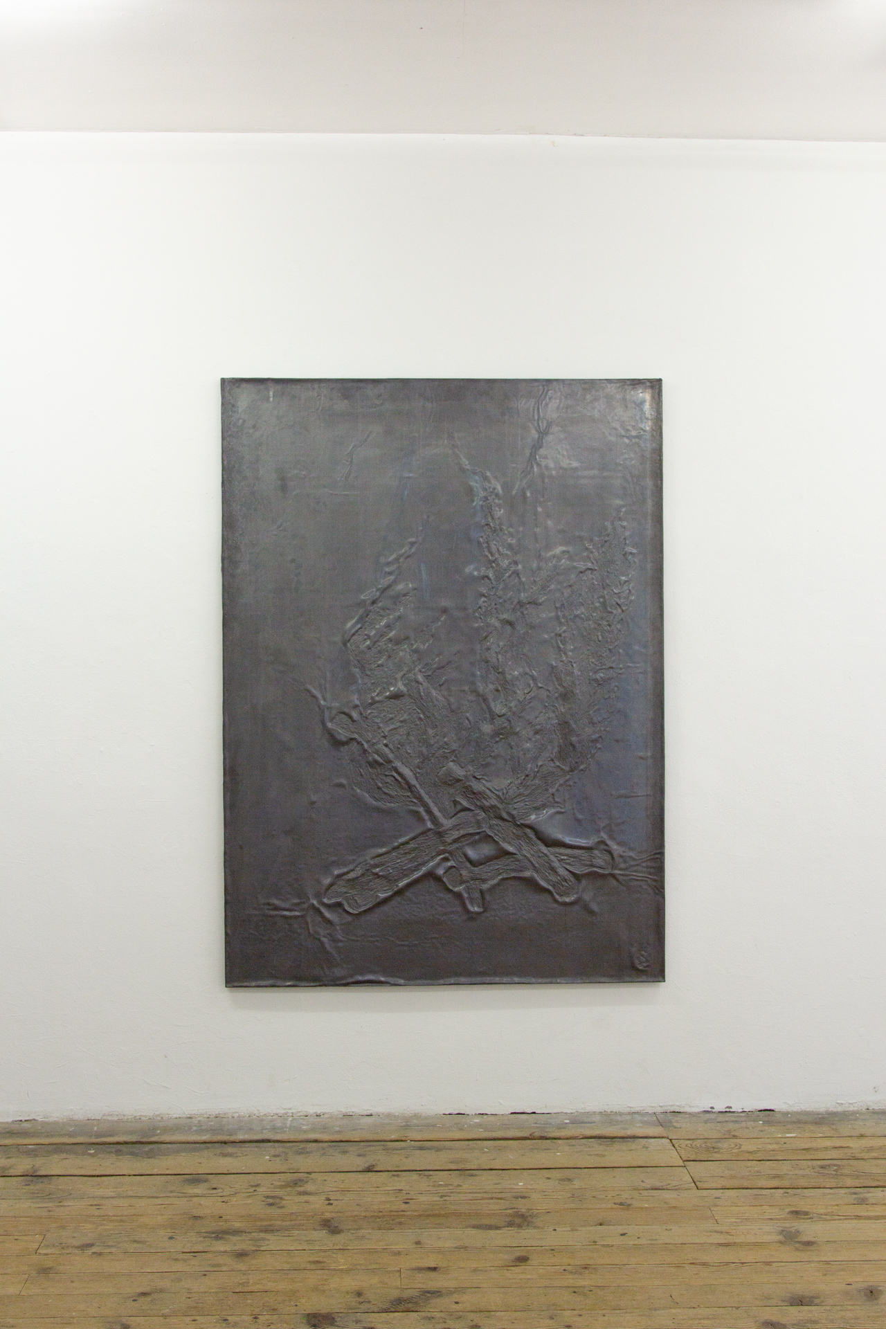 Selina Lutzs Test ist auf Seide gemalt und mit Tintenkiller wieder ausgelöscht. Zurück bleibt eine Doppelung als Spiegelbild und als Rohrschach-Test, der psychologischen Diagnose, die aufgrund der Deutung gespiegelter Farbklecksen Einblick in die Persönlichkeitsstruktur gibt. Im Kontrast zu der luftigen Seide stehen I’m afraid of the fear, Lutz’ Hüte aus Blei. In dasselbe giftige Material hämmerte sie Höhen und Tiefen und lässt durch Einkerbungen das Bild eines Feuers entstehen.