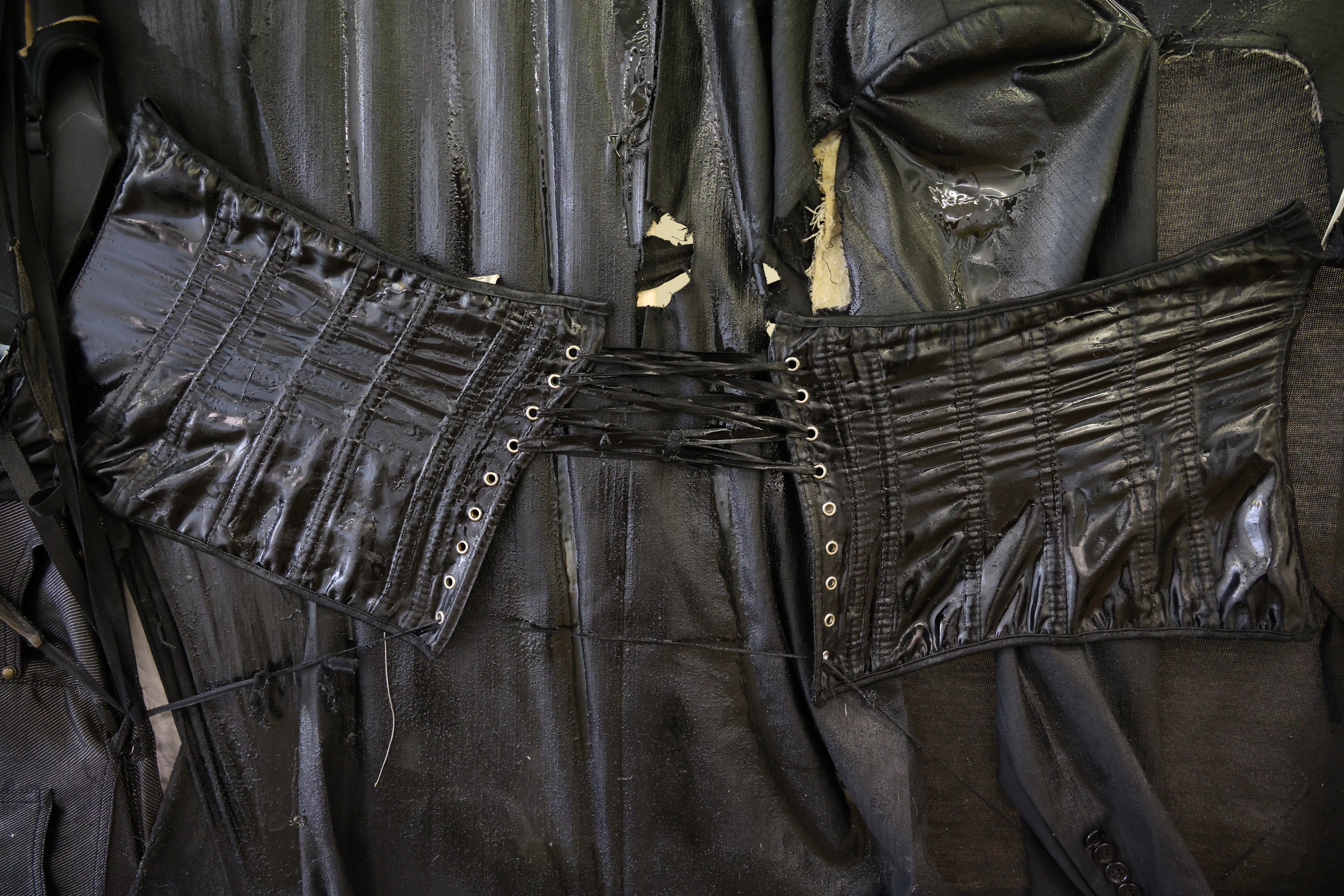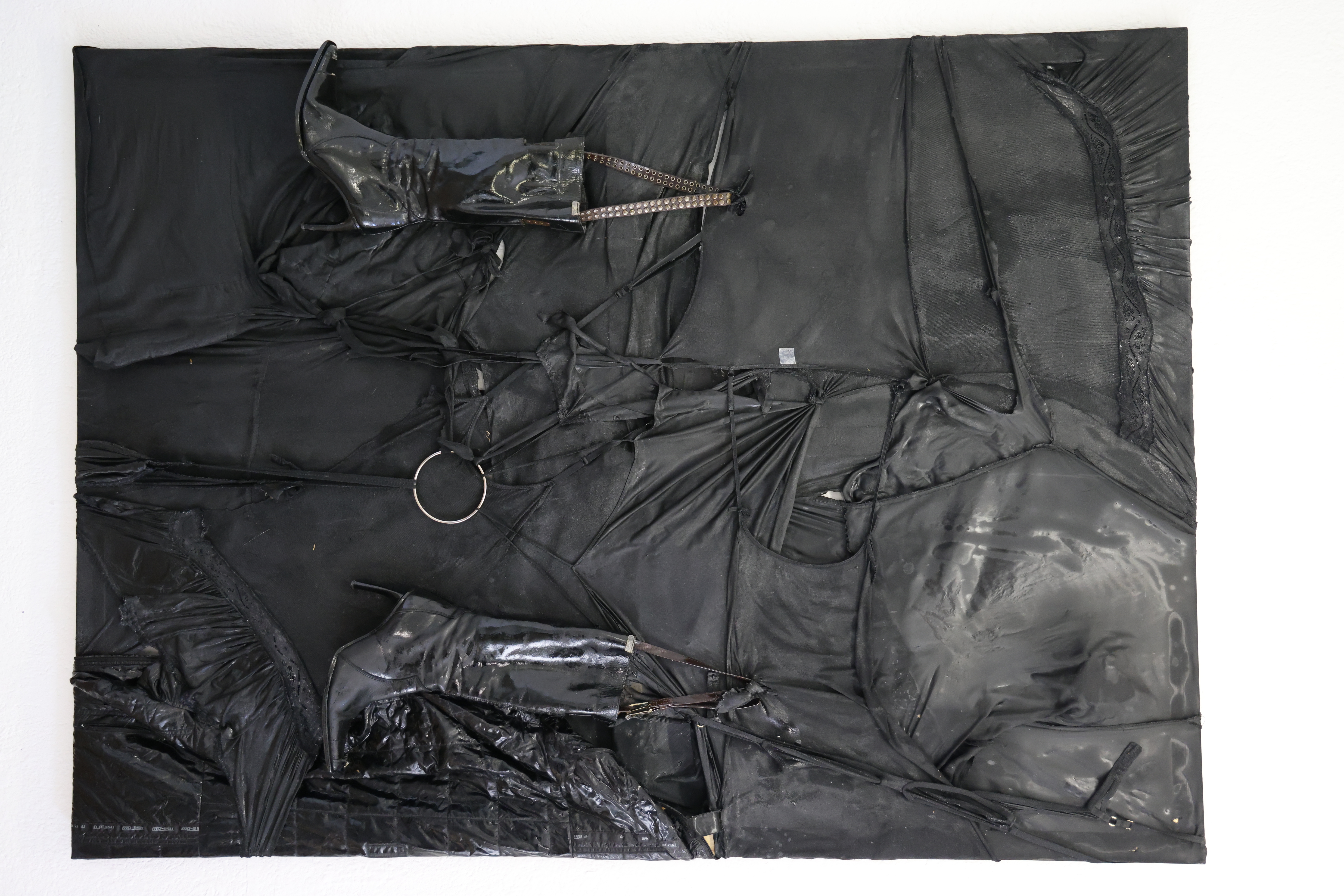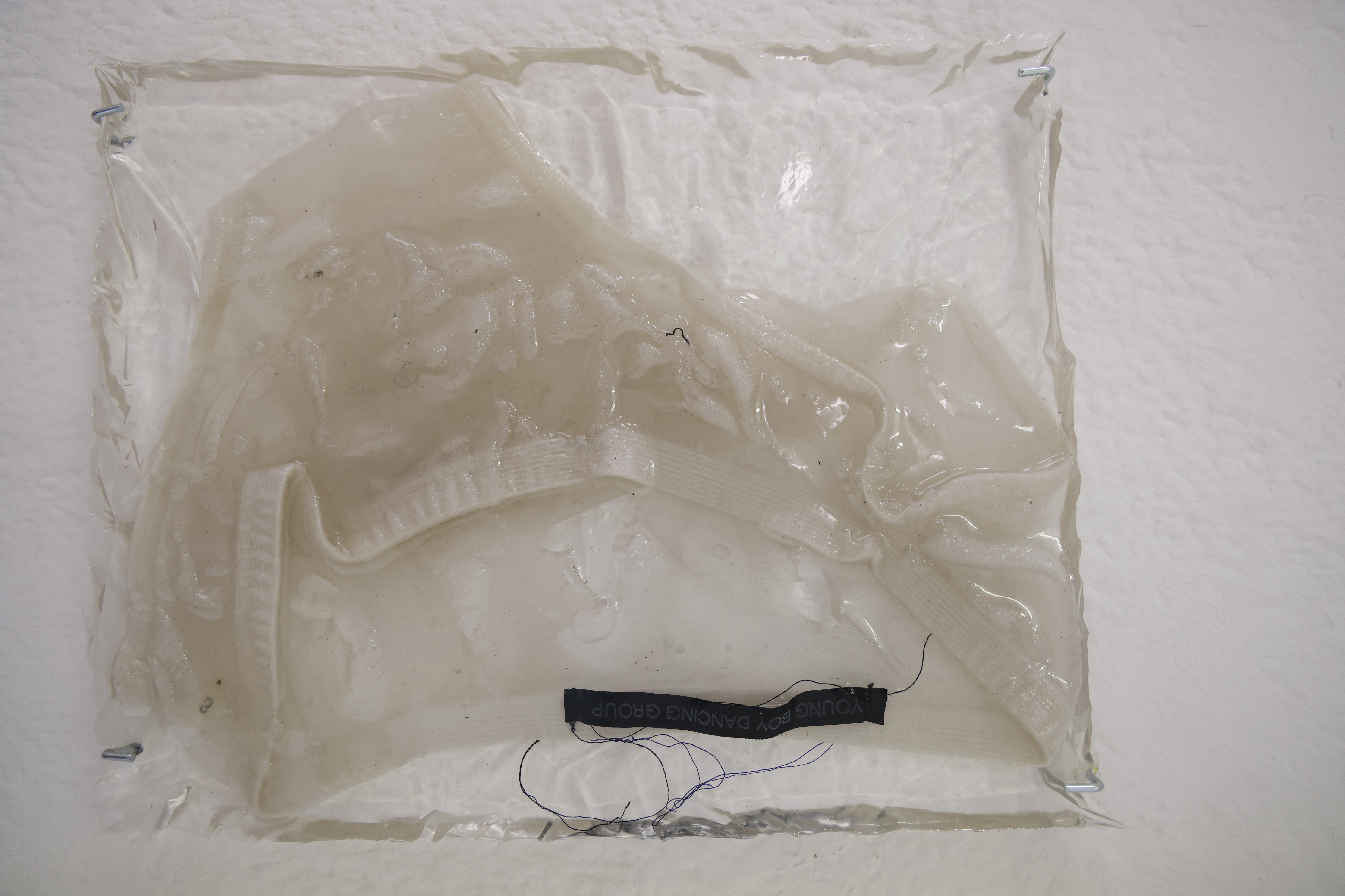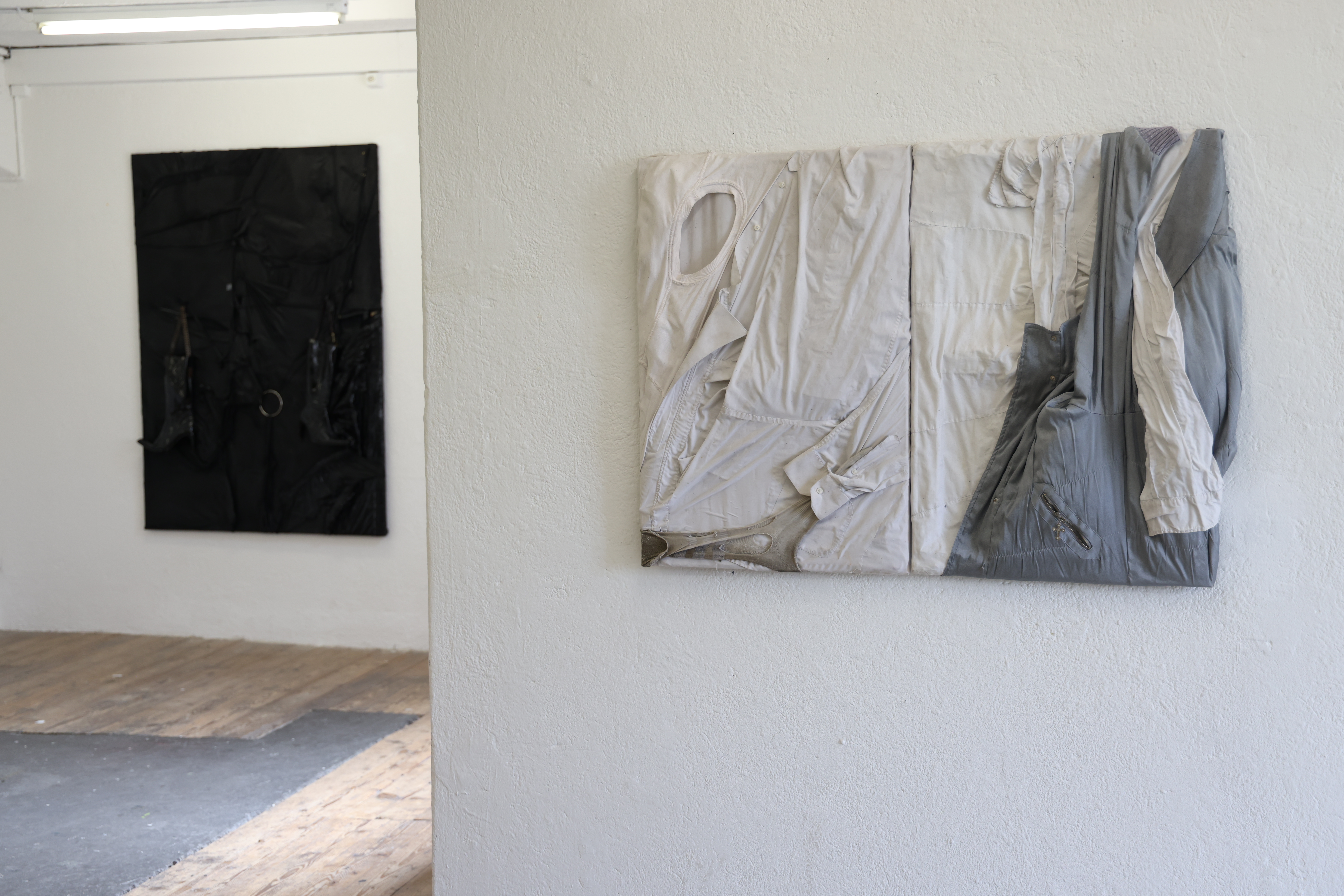 The works shown here are assembled from clothes, found, collected, modified, bleached, stretched, stressed to fit. They channel the raw energy from their performances, each work or series functioning as an archive from performances, in squats, clubs, galleries or institutions. While the works are reminiscent of monochromatic paintings, they go beyond a somewhat static representation of a moment in time. They are more dynamic explorations of the relationship between body and movement, transposing what is in movement into a rigid format. In doing so, they capture the essence of the group›s improvisational style, which is rooted in the belief that movement is not just something that happens in the body, but that it is an integral part of the body itself.