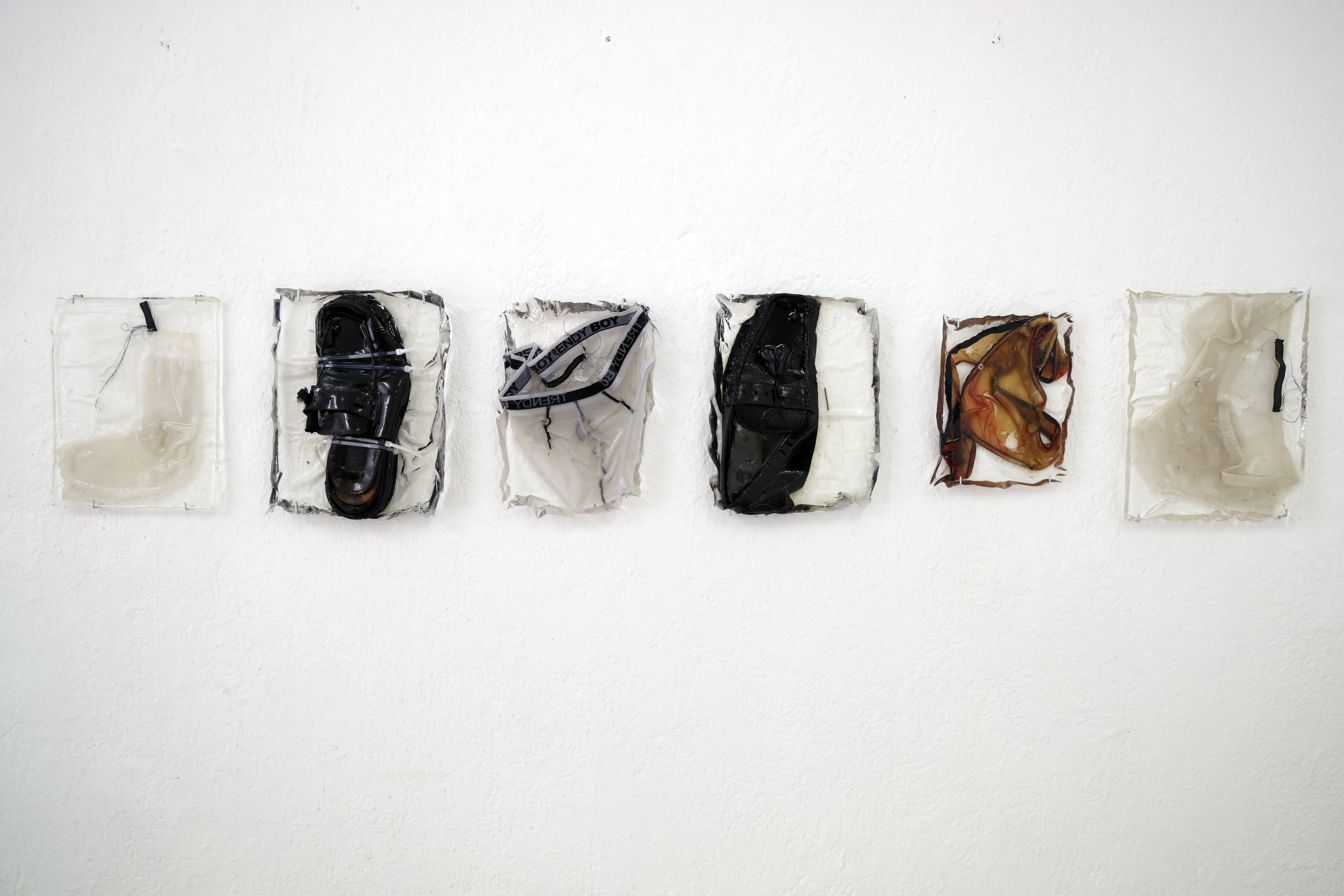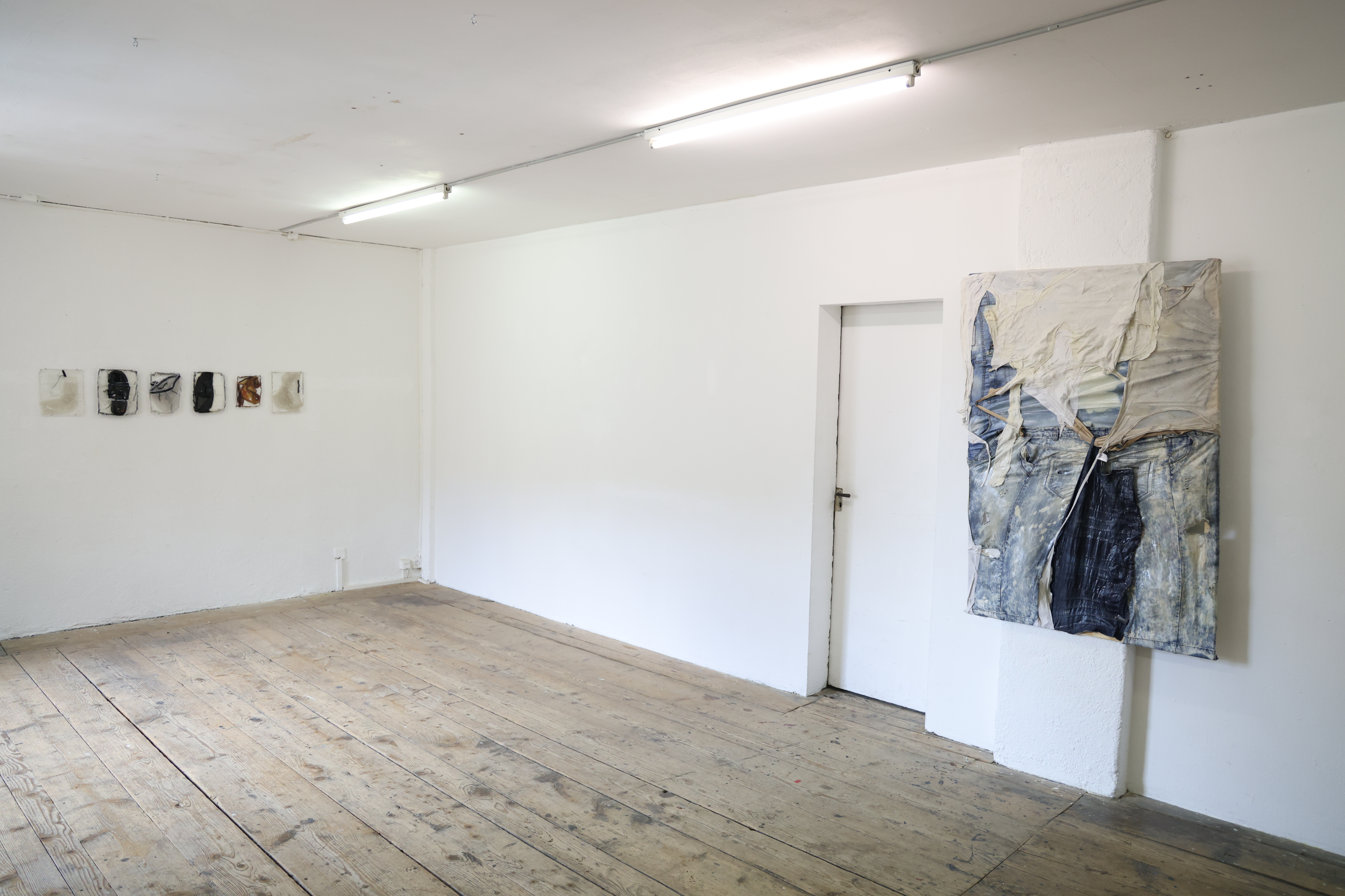 Die ausgestellten Arbeiten sind aus gefundenen, gesammelten, veränderten, gebleichten, gedehnten und gestressten Kleidungsstücken zusammengesetzt. Sie bündeln die rohe Energie der Performances, wobei jedes Werk oder jede Serie wie ein Archiv einer Performance funktioniert, aus einem besetzten Haus, einem Club, einer Galerie oder einer Institution. Die Arbeiten erinnern an monochrome Gemälde, gehen aber über die statische Darstellung eines Moments in der Zeit hinaus. Sie sind dynamische Erkundungen der Beziehung zwischen Körper und Bewegung und übertragen das, was in Bewegung ist, in ein starres Format. Auf diese Weise fangen sie das Wesen des Improvisationsstils der Gruppe ein, der in der Überzeugung wurzelt, dass Bewegung nicht nur etwas ist, das im Körper passiert, sondern dass sie der integrale Bestandteil des Körpers selbst ist.